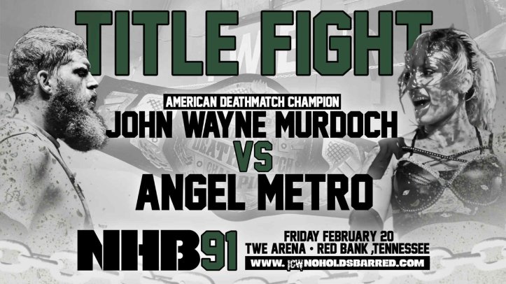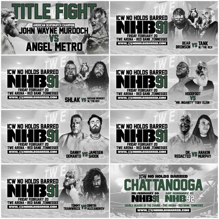 ICW No Holds Barred 2/20/2026 NHB 91 results from the TWE Arena in Red Bank, Tennessee. The event streamed live on IWTV.