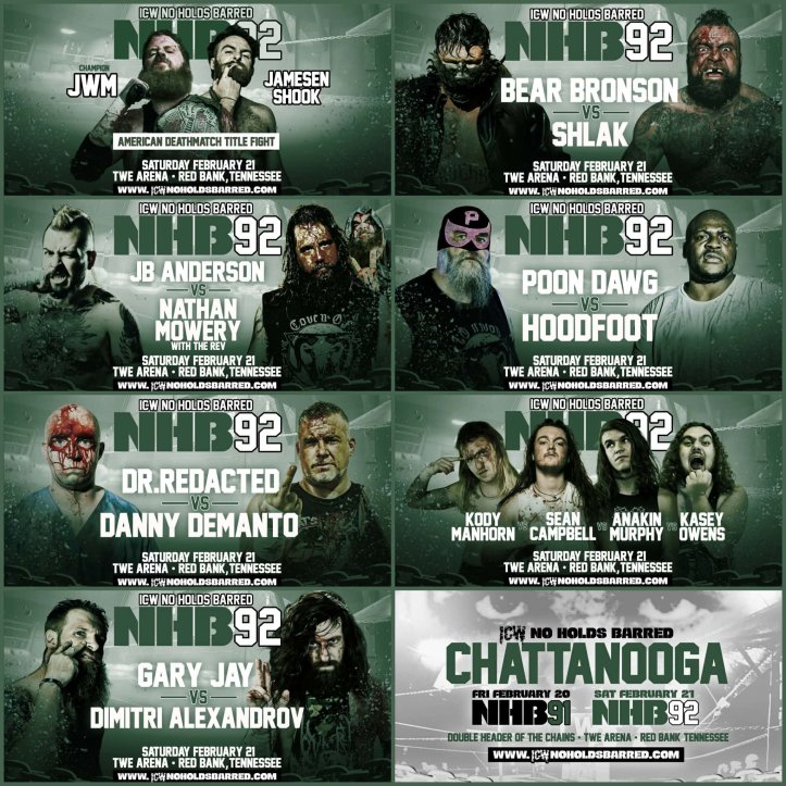 ICW No Holds Barred 2/21/2026 NHB 92 results from the TWE Arena in Red Bank, Tennessee. The event streamed live on IWTV.