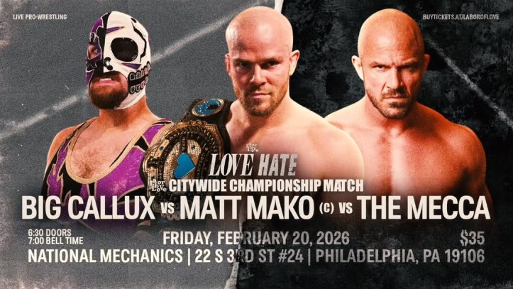 6. Labor of Love Citywide Championship Three Way Match: Matt Mako (c) def. Big Callux and The Mecca to retain the championship