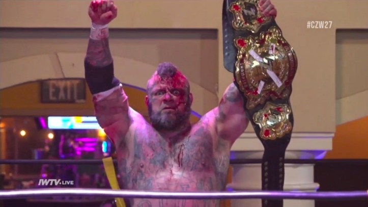 A new CZW Ultraviolent Champion was crowned tonight at Coopers Riverview in New Jersey for the 27th Anniversary of Combat Zone Wrestling. The championship that has been inactive since 2012 was decided in an Ultraviolent Elimination Scramble Match between Eric Ryan, Lucky 13, Nick Gage (filling in for Alex Colon), Jimmy Lloyd, SHLAK and Hoodfoot.