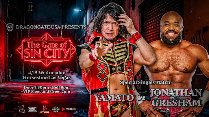 Dragongate veteran YAMATO will take on the debuting Jonathan Gresham at Dragongate USA’s “The Gate Of Sin City” on Wednesday, April 15th. The special singles match is a rematch of their encounter at GCW Drop Dead in 2022. Gresham came out the victor in that contest.