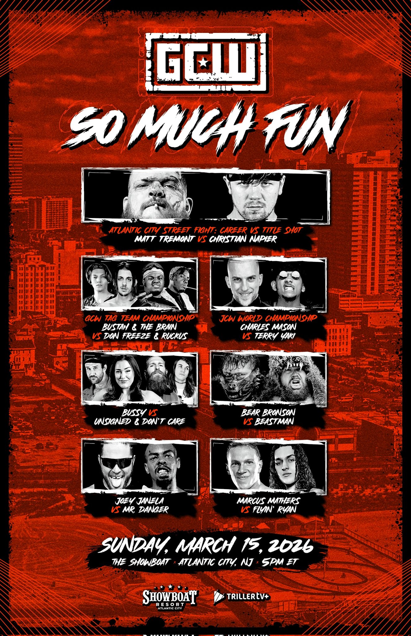 Game Changer Wrestling 3/15/2026 GCW So Much Fun results from The Showboat in Atlantic City, New Jersey. The event streamed live on TrillerTV+.