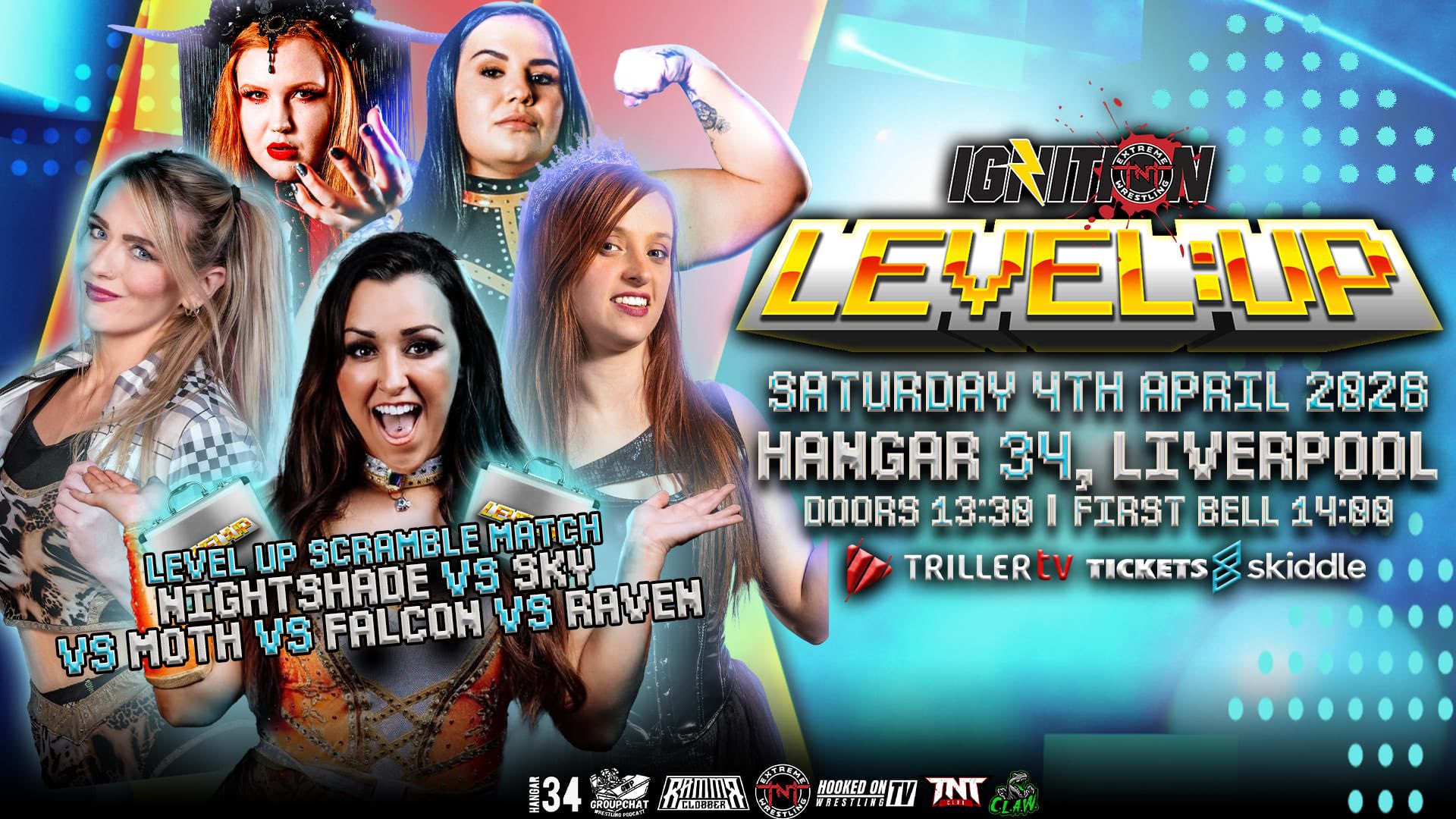 TNT Extreme Wrestling 4/4/2026 Ignition Level Up results from Hangar 34 in Liverpool, England. The event streamed live on TrillerTV+.